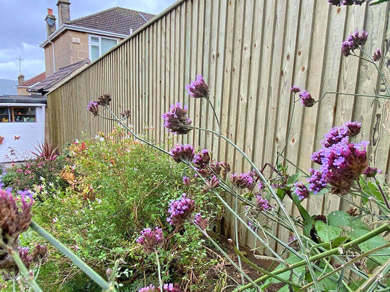 Système de clôture en kit, de style Douvres, avec palis verticaux et biseautés, se recouvrant par chevauchement. Finition brut de sciage. Clôture sans cadre.